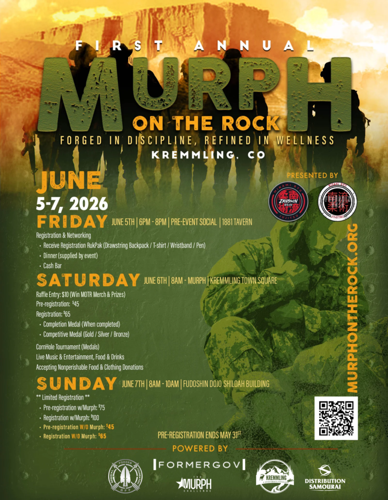 Join us for the First Annual Murph on the Rock, taking place June 5–7, 2026, in beautiful Kremmling, Colorado. This special event is proudly affiliated with the Murph Challenge and brings together athletes, families, and supporters for a powerful weekend of fitness, camaraderie, and purpose.